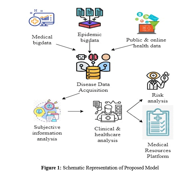 The module automates data collection, organizing, analyzing, and graphing, creating a comprehensive data repository for pandemic details like infectious disease transmission. This streamlines gathering data, relationships between healthcare, and dissemination, improving the health of the public knowledge rapidity and credibility of disease prediction. The subjective element of the proposed model analyzes the information demands of many stakeholders, including government, healthcare organizations, businesses, the news media, and the general population, during an outbreak of an illness. The authorities require worldwide data and information. Healthcare providers require resources from the network, knowledge of the prevention of epidemics, individual medical information, and illness diagnosis reference databases. Businesses need an organizational collection of data that accurately reflects the general public's views, actions, and motives. Media demands encompass information sources, validity, and timeliness. Public needs include understanding risk and healthcare facility. The application model examines big data technology applications during the earlier prevention and recovery phase of modern outbreaks. During the initial preserving phase, the essential functions related to pandemic impact management and precise information diffusion. During pandemics, big data's critical applications include tracing and anticipating transmission paths, following infected individuals, screening close contacts, and conducting intelligent medical and medication research. During recovery, the essential applications include assisting businesses in resuming operations, fostering government-public relations, and optimizing control plans for epidemics.