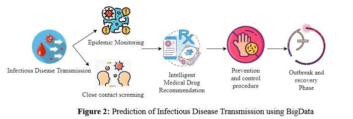 Figure 6 shows the illustration of bigdata from various sources, such as demographic information, hospital tracks, communication feed, and environmental factors, is made possible through the use of analytics for big data. Researchers can get insights into mechanisms regarding illness propagation and pinpoint high-risk people or places by analyzing various data sources. Public health authorities are able to quickly recognize and respond to growing epidemics by continuously gathering and analyzing data streams. These data streams include hospitalizations, symptom news accounts, and mobility patterns. This allows the authorities to intervene to minimize transmission rates as quickly as possible during the outbreak. Researchers can construct models that can predict expected transmission rates under various scenarios and evaluate the potential impact of intervention strategies on reducing transmission by merging historical epidemiology data alongside real-time data streams. A significant reduction in the transmission rate indicates that the steps implemented, whether the use of vaccination programs, protocols for quarantine, measures to isolate individuals, or other measures, have successfully reduced the spread of the illness within the local population.