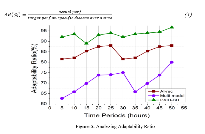 It is possible to gain knowledge of the capacity to adapt forecasting techniques to changing demographic circumstances by contrasting the actual precision with the anticipated accuracy. The ability to adjust the system is evaluated when actual reaction actions are assessed in terms of timeliness and efficacy compared to predefined agility criteria. This evaluation determines how quickly tactics may be adjusted in response to new threats. In these situations, researchers can evaluate the efficacy and robustness of big data-driven approaches to forecasting and preventing the transmission of infectious diseases by measuring the adaptability ratio. This research can provide valuable insights for future optimization efforts and serve as a roadmap for creating public health systems that are more adaptable and responsive, as shown in Figure 5 using Equation (1).