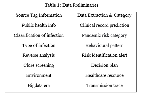 Analyzing the data is the central component of the entire process of big data. This includes the analysis of the importance of pandemic details, the subjective attitude ability , and the forecast of epidemic progression, among other things. It accomplishes this by transforming data from several sources into mathematical models following the logic of the industry for needs in the business. This allows technology that is capable of generating autonomous outcomes in accordance with the demands of the algorithm in order to satisfy the process of making decisions requirements. On the other hand, the essence of data analytics is data modelling to support business decision-making. Furthermore, this dictates that the technique of analysis needs to be altered from fundamental investigation to skill learning, from reasoning to associative regulation, as well as from qualitative assessment to the enhanced interpretation of the matching of patterns. These changes are necessary since they are necessary in order to achieve the desired results. Table 1 defines the collected data preliminaries for analyzing the impact of big data.