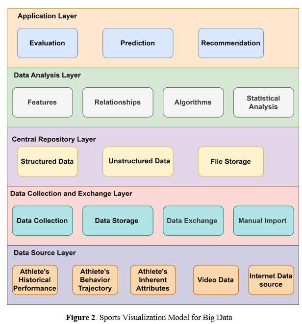 The Big data-based sports visualization model comprises five layers: Application, Data Analysis, Central Repository, Data Collection and Exchange, and Data Source. The Application layer provides a user-friendly interface for data analysis, while the Data Analysis layer collects and evaluates data from various sources. The Data Collections and Exchange layer collects and exchanges information, while the Data Source layer ensures data precision and dependability.