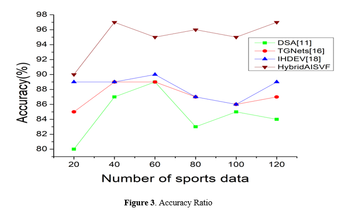 In figure 3, An accurate measurement of the HybridAISVF model's accuracy is the degree to which its predictions correspond with the actual outcomes. This statistic is essential for determining how well the model performs when it comes to processing data pertaining to sports and making decisions based on that information. The optimization of player performance, strategic planning, and decision-making processes can be facilitated by sports teams, coaches, and other stakeholders when they have a high accuracy score.