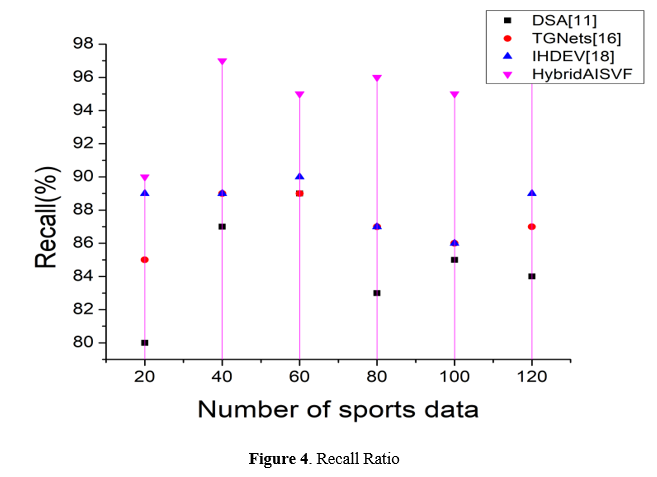 To effectively identify all important instances contained within a dataset, the HybridAISVF model in Figure 4, which is a blend of AI and Big Data Visualization, makes use of recall as a critical metric throughout the process. It is possible to determine whether or not the model is successful in gathering and identifying essential information, such as key performance indicators, player strengths, and strategic insights, by examining the recall score. The importance of this metric cannot be overstated in the field of sports analytics since it guarantees that significant aspects of player performance, team dynamics, and game outcomes are not missed. A high recall rate can provide significant insights and recommendations to sports teams, coaches, and analysts, which enables them to make decisions based on accurate information, optimize player strategies, and improve team performance. When it comes to sports data analysis, having a strong recall metric contributes to a more accurate and thorough analysis, which eventually leads to improved outcomes and competitive advantages in the sports enterprise.