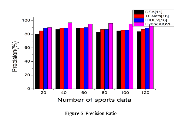 In Figure 5 ,The precision of the predictions made by the HybridAISVF model, which is a combination of AI and Big Data Visualization, is a significant parameter that is used to quantify the accuracy of the prediction model. When the precision score is high, it suggests that the model is reliable in recognizing patterns and trends in the data accumulated from sports. If it comes to making decisions in the sports sector, this statistic is absolutely necessary because it guarantees that the predictions made by the model are reliable and valuable. With a high precision rate, sports teams, coaches, and analysts are able to make judgments based on accurate information, optimize plans, and create increases in performance capabilities. This robust accuracy metric improves the dependability and efficiency of data-driven studies, which in turn boosts competitiveness and success in the ever-changing landscape of the sports industry.