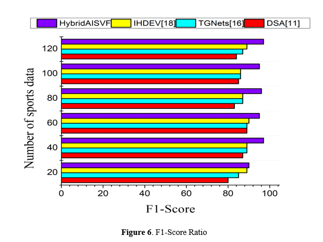 In Figure 6, the context of the HybridAISVF (Hybrid Artificial Intelligence and Big Data Visualization Framework) model, the F1-score is a comprehensive metric that includes both precision and recall to provide a balanced assessment of the model's performance. A single value that takes into consideration both the model's capacity to make accurate positive predictions (precision) and its capacity to capture all relevant occurrences (recall) is provided by the F1-score in the HybridAISVF model. This score is the mean of precision and recall together.A well-rounded performance is shown by a high F1-score in the HybridAISVF model. This denotes that the model is able to attain both high precision and high recall at the same time. Since it ensures that the model can efficiently identify crucial patterns, trends, and insights while simultaneously minimizing the number of false positives and false negatives, this statistic is especially useful in the field of sports data analysis.It is possible for sports teams, coaches, and analysts to harness more reliable and complete insights from the data by optimizing the F1-score in the HybridAISVF model. This can result in informed decision-making, strategic planning, and performance enhancements. Having a high F1-score demonstrates that the model is helpful in providing recommendations that are both accurate and actionable, which eventually leads to improved outcomes and competitive advantages in the market for sports.