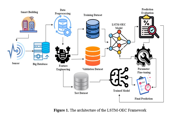 Through thorough experimentation and validation, the study seeks to showcase the effectiveness of LSTM-based energy management systems in achieving substantial reductions in energy consumption while ensuring occupant comfort levels. The study's primary outcomes demonstrate the LSTM-OEC model's superiority over conventional forecasting methods [16], underscoring its capacity to transform energy management strategies in intelligent buildings. Moreover, the findings of the study highlight the potential for the proposed technique to be easily expanded and adjusted, thereby facilitating its widespread use in the pursuit of sustainable infrastructure development. This study signifies a notable advancement in enhancing energy efficiency in intelligent buildings by combining big data analytics [17] and machine learning techniques [18]. The study aims to utilize LSTM neural networks [19] to provide building managers and stakeholders with practical insights that can contribute to the advancement of a sustainable and energy-efficient future.