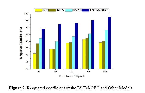 Figure 2 depicts the R-squared coefficient values for the LSTM-OEC model and other models, specifically RF, KNN, and SVM, at various epoch counts. The R-squared coefficient values indicate the extent to which the models explain the variance in the energy consumption data, with larger values suggesting superior prediction accuracy. After careful examination, it is clear that the LSTM-OEC framework continuously surpasses the existing algorithms in performance throughout all epochs. The LSTM-OEC model performs better than RF, KNN, and SVM, with an R-squared coefficient of 89.15% after 20 epochs. With increasing epochs, the LSTM-OEC model demonstrates greater superiority, as evidenced by its R-squared values reaching 97.89% at 100 epochs, which is the greatest among all models. The outstanding success of the LSTM-OEC model can be attributed to its ability to accurately capture complex temporal relationships and adapt to changing energy consumption patterns in intelligent buildings. The recurrent design of the LSTM-OEC model facilitates their ability to effectively acquire knowledge from sequential data, leading to enhanced predicted accuracy and improved exploitation of real-time sensor information.