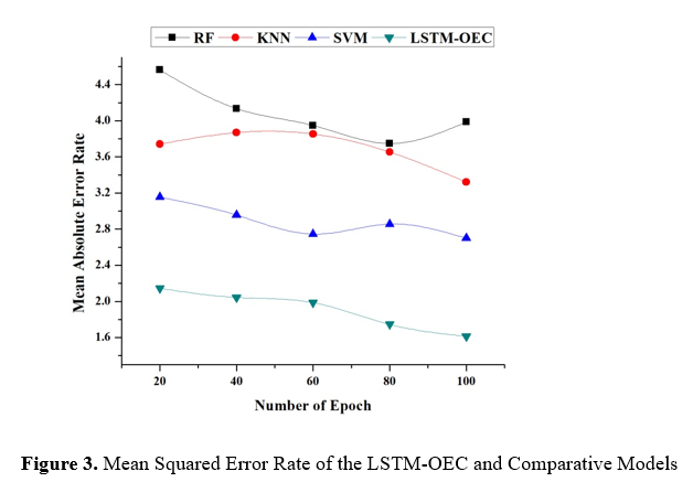 Figure 3 displays the MSE rates for the LSTM-OEC model and its comparator models, namely RF, KNN, and SVM, across several epochs. The MSE rate is a metric that measures the average squared deviation between projected and actual energy consumption figures. Decreased values of the MSE rate indicate higher levels of predictive accuracy. After careful examination, it is clear that the LSTM-OEC model continuously surpasses the other models in terms of MSE rates over all epochs. The LSTM-OEC model performs better than RF, KNN, and SVM, achieving the lowest MSE rate of 2.145 after 20 epochs. The LSTM-OEC model has constantly improved performance as the number of epochs grows, continually demonstrating lower MSE rates than the other models. The remarkable effectiveness of the LSTM-OEC model can be attributed to its ability to accurately represent complex temporal relationships and adapt to changing patterns of energy use in smart buildings. The LSTM architecture facilitates the model's ability to efficiently acquire knowledge from sequential input, leading to enhanced predictive accuracy and improved management of energy use.