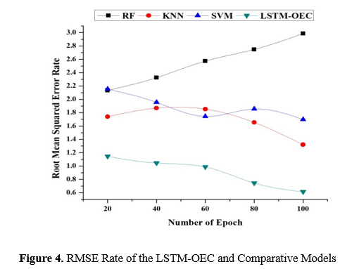 Figure 4 illustrates the RMSE rates for the LSTM-OEC model and its comparator models, namely RF, KNN, and SVM, across several epochs. The RMSE is a metric that measures the average squared deviation between projected and actual energy consumption numbers. A lower RMSE value signifies a higher level of prediction accuracy. After careful examination, it is clear that the LSTM-OEC model continuously surpasses the other algorithms in terms of RMSE rates over all epochs. The LSTM-OEC model performs better than RF, KNN, and SVM, with the lowest RMSE rate of 1.145 after 20 epochs. The LSTM-OEC model has consistently improved performance as the number of epochs grows, consistently demonstrating lower RMSE rates than the other models. The excellent success of the LSTM-OEC model can be attributed to its ability to effectively capture complex temporal relationships and adapt to dynamic patterns of energy usage in smart buildings. The model can efficiently learn from sequential data thanks to the LSTM architecture, which improves prediction accuracy and optimizes energy consumption.