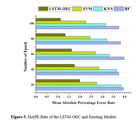 Figure 5 illustrates the MAPE rates throughout several epochs for the LSTM-OEC model, as well as the other models presently employed, namely KNN, RF, and SVM. The MAPE is a quantitative measure that assesses the average percentage discrepancy between anticipated and actual usage of energy figures. An MAPE number that is lower indicates a higher level of prediction accuracy. Based on the conducted analysis, it is evident that the LSTM-OEC paradigm consistently demonstrates greater performance in terms of MAPE rates when compared to the current models. After 20 epochs, the LSTM-OEC model demonstrates the lowest MAPE rate of 1.987%, surpassing the performance of RF, KNN, and SVM. The LSTM-OEC model has constant higher performance as the number of epochs grows, consistently demonstrating lower MAPE rates than the other models. The tremendous efficacy of the LSTM-OEC model can be attributed to its ability to effectively capture complex temporal linkages and adapt to dynamic patterns of energy use in smart buildings. The LSTM architecture enables efficient knowledge acquisition from sequential data, enhancing predictive accuracy and improving energy usage management.