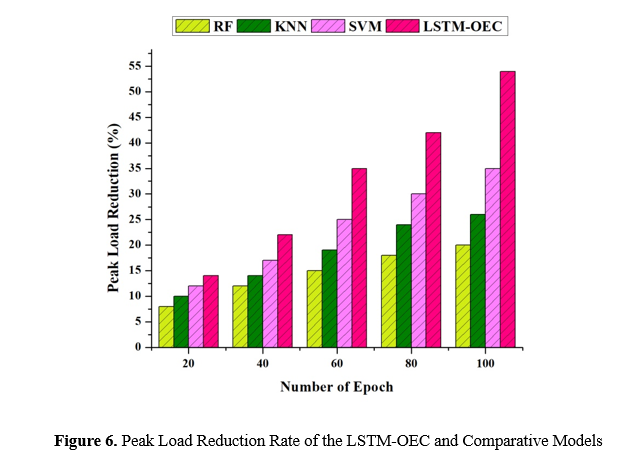 Figure 6 presents the PLR rates for the LSTM-OEC and comparator models, namely RF, KNN, and SVM, at different epochs. PLR is a metric used to evaluate the ability of models to reduce peak energy demand during periods of high demand. A higher rate of PLR indicates greater effectiveness in optimizing energy usage. It is evident from a thorough analysis that the LSTM-OEC system continuously outperforms the comparator systems in terms of PLR rates across all epochs. The LSTM-OEC model demonstrates a Peak Load Reduction rate of 14% after 20 epochs, outperforming the RF, KNN, and SVM models. The LSTM-OEC model demonstrates its superiority as the number of epochs increases, as evidenced by its PLR rates of 54% at 100 epochs, notably greater than the other models. Predictive insights enable the LSTM-OEC model to dynamically regulate energy usage and capture complex temporal correlations, which contributes to its excellent performance. The recurrent architecture of the system facilitates the efficient acquisition of knowledge from sequential data, leading to the development of proactive energy management methods that effectively mitigate peak energy demand and improve overall energy efficiency in smart buildings.